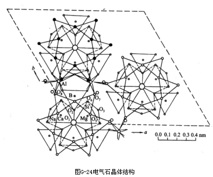 【晶體結(jié)構(gòu)】三方晶系; -R3m;a0=1.584~1.603 nm,c0=0.709~0.722 nm;Z=3。電氣石晶體結(jié)構(gòu)基本特點(diǎn)為[SiO4]四面體組成復(fù)三方環(huán)。B配位數(shù)為3,組成平面三角形;Mg配位數(shù)為6(其中有兩個(gè)是OH-),組成八面體,與[BO3]共氧相連。在[SiO4]四面體的復(fù)三方環(huán)上方的空隙中有配位數(shù)為9的一價(jià)陽(yáng)離子Na+分布。之間以[AlO5(OH)]八面體相聯(lián)結(jié)(圖G-24)。